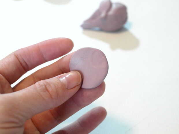 3. una vez que eres arcilla se siente lo suficientemente flexible y es el color deseado, sacar una pequeña sección y rodar en una bola (sobre el tamaño de una arveja). Luego con los dedos, smoosh eso bola de arcilla plana y lisa (pero no demasiado fina ya que quiere tus pétalos de rosa para ser durable después de hornear) para formar un disco pequeño de barro.