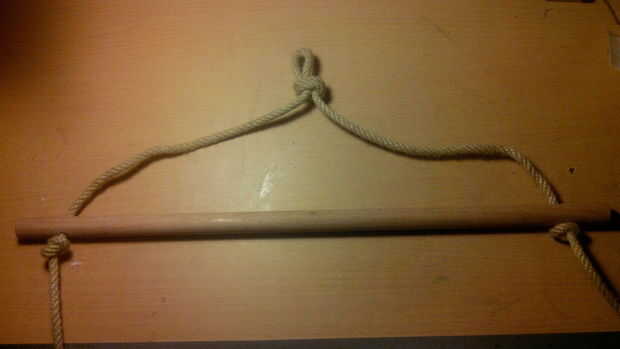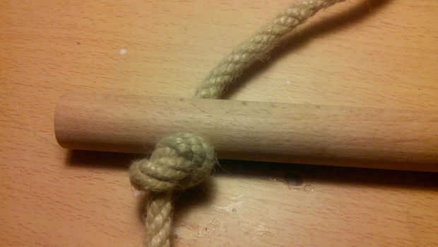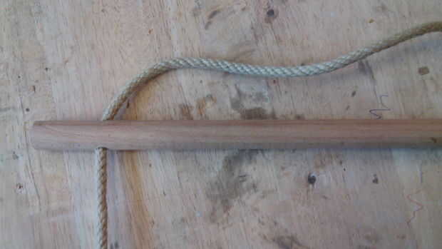 Esto todavía no es suficiente. también tienes que añadir alguna cuerda que vendrá en el otro lado de la palanca. Esto tiene que ser la distancia entre los agujeros (para mí esto era 50cm), más algún extra para hacer un lazo y algún espacio adicional entre la cuerda y el palo (unos 20cm)