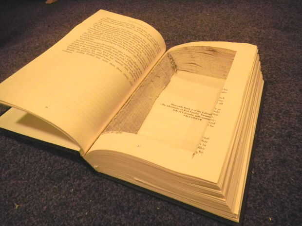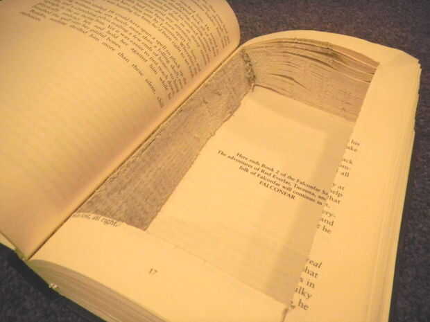 Una vez que termine de cortar, retire con cuidado el centro de su compartimiento secreto. Habrá una porción de polvo de papel, por lo que usted puede hacer esto sobre un trozo de periódico para coger cualquier cosa, con una aspiradora cerca.