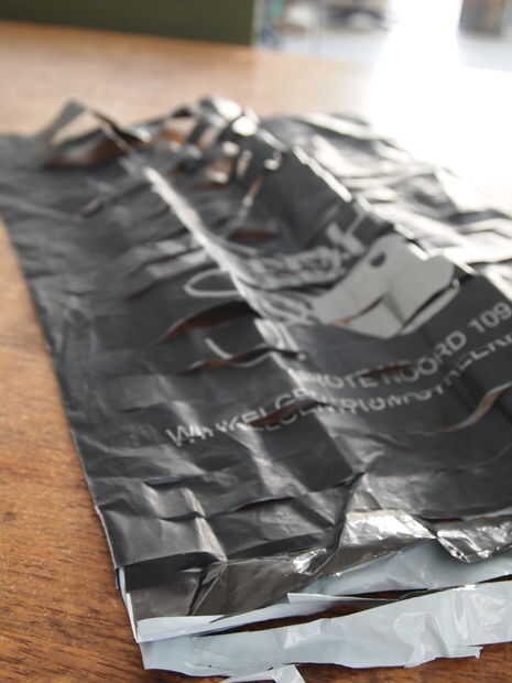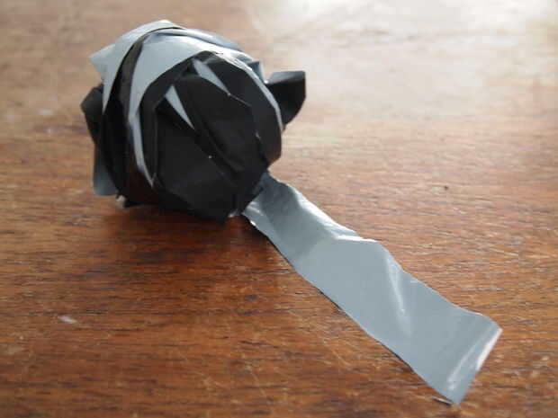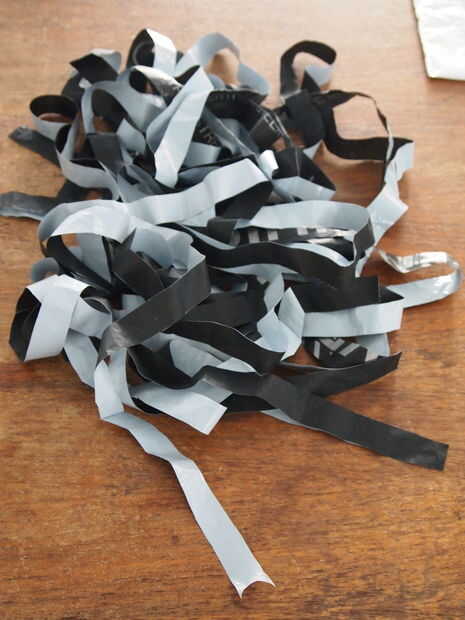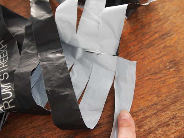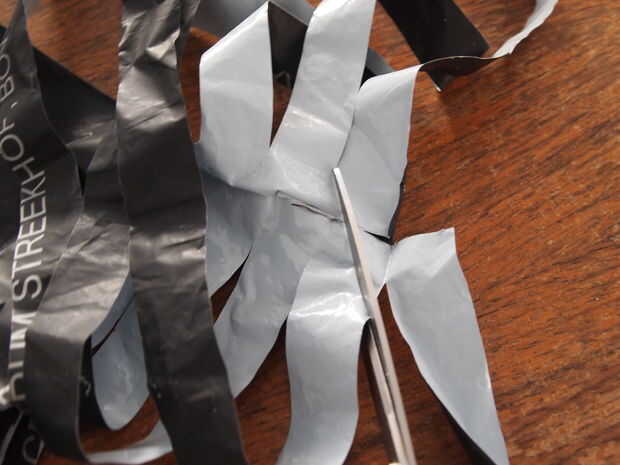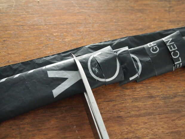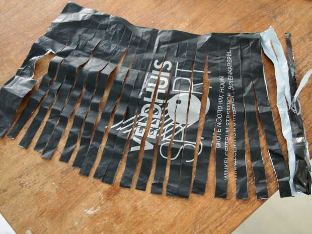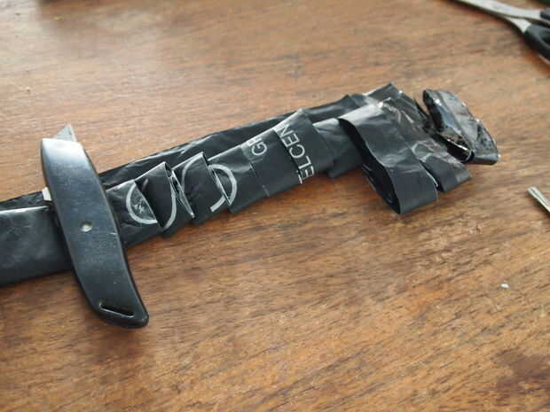 Ahora cortar el "rollo". Usé una tijera, el cuchillo en la foto es sólo añadir peso. Corte ranuras por el rollo, pero dejan el espacio de lado sin tocar (3 cm) corté mis rendijas con aprox 2 cm entre. Si el plástico es más fino o más suave puede que sea mayor, si trabaja con una bolsa muy sólida más gruesa, hacer menos.