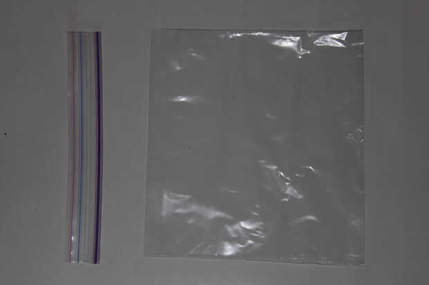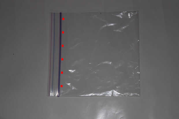 Comenzar con cortar la parte superior de la bolsa de Ziplock indicada por la línea roja del puntillo. Asegúrese de mantener el corte limpio y uniforme.
