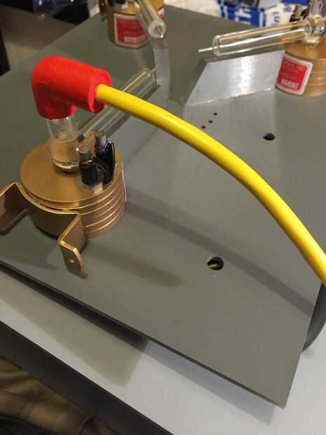Pegué el cable amarillo en uno de los extremos de la articulación del codo, luego coloca el ontop codo del tubo de vidrio que sale de la parte superior de la solenoide y había medido el cable en el orificio en la base. corté el cable un poco más por lo que algunos juegan en la curva por lo que la curva se puede hacer más largo o más corto.