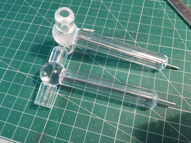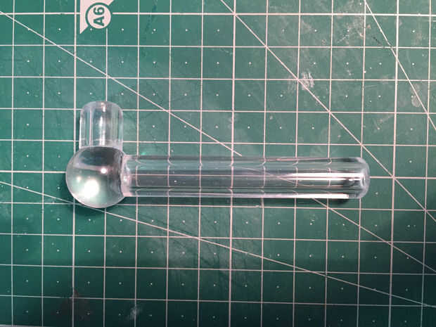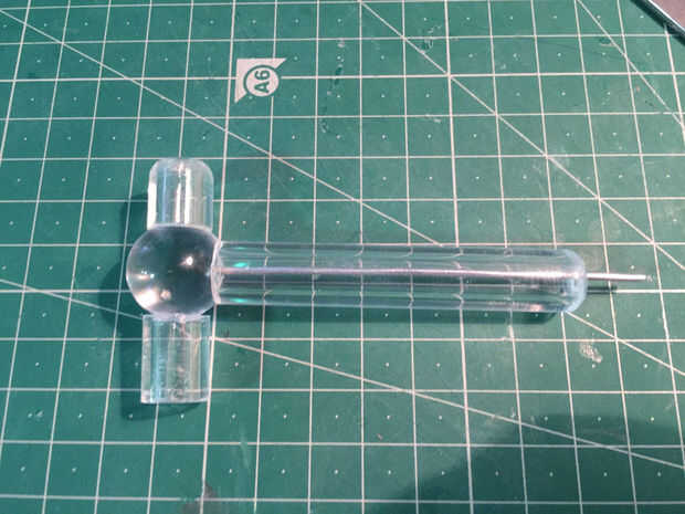 Pegué el 70mm hacia un lado plano de la bola. se trata de la parte que se extiende hacia el lado del solenoide. Luego pegué el tubo de 15mm con el extremo redondeado hacia el otro lado plano de la bola se trata de la parte superior de la estructura de cristal, el último tubo de 15mm se va pegado a la parte inferior de la bola enfrente del tubo redondo corto. este bit pasará al agujero del solenoide así que no necesita una superficie plana, pero si quiere usted puede.