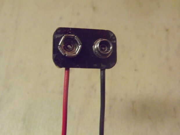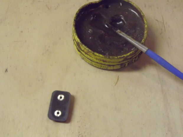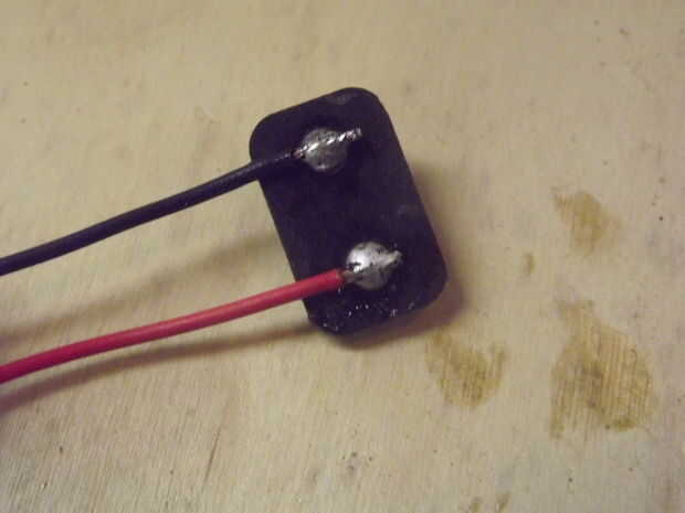 Finalmente, tomar el pincel ácido y aplicar una buena cantidad de flujo a los contactos y les agregue soldadura hasta cubre el agujero en el centro no tarda que mucho. ahora soldar los extremos estañados del alambre para las pastillas de contacto en la parte posterior. Una vez que ha hecho habrá terminado el clip de la batería de 9 voltios.
