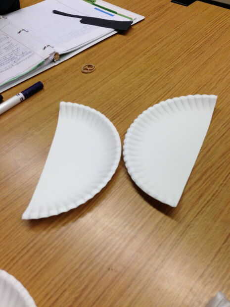 Coge otro plato de papel y cortar por la mitad para las orejas