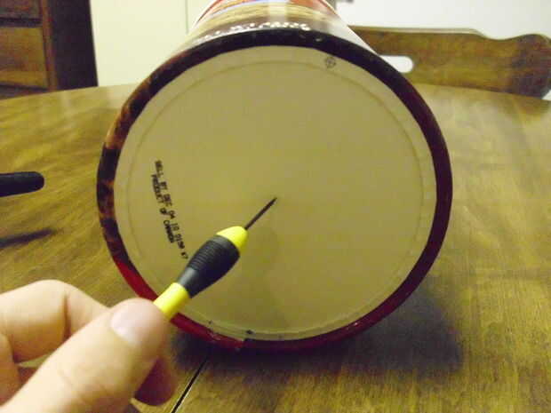 En primer lugar, vamos a hacer un pequeño agujero en la parte inferior de la lata. Esto es donde la cadena irá más adelante. Girar a la lata de costado y utilice un destornillador para hacer un pequeño agujero en la parte inferior. Debe ser no más grande que la cadena, para todo lo agradable y cómoda.