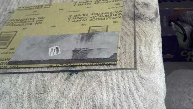 Ahora vamos a empezar a montar nuestras piedras mojadas. Primero permite iniciar con el papel de lija 600 y tomar uno de nuestros azulejos y alinearla en el papel por lo que hay una proyección leve en dos de los lados. (un lado corto y lado largo) Una vez hecho esto, corte al ras contra un borde, dejando una pieza ligeramente sobredimensionado que ayudará en el proceso de encolado.