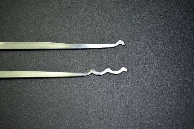 Se trata de lockpicks extremadamente versátil. Estas dos selecciones anidadas cerradura cada tienen una llave de torsión en el extremo, y los consejos tienen un gancho mitad diamante o el rastrillo. No voy a repasar cómo con estas demasiado profundamente, pero con la mitad de diamante, solo usas para levantar cada perno a la línea pura durante el uso de una llave de tensión de pick. Con el rastrillo, rastrillo y salir rápido, mientras zangoloteo y bajar un poco. Aplicar tensión super ligera con el medio diamond. He escuchado la tensión descrita como presionando una tecla de ordenador. Extremadamente ligero. Me gusta pensar que si en un pedazo de gelatina.