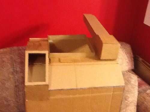 • Entonces corté un tubo de cartón por la mitad (longitud sabio)... que había pegado a la mitad de la espalda y dos tapas para la parte superior e inferior. La razón de esto es que este particular robot básicamente se rompe por la mitad durante el modo de vehículo, un poco como una "U" con la reunión de la cola para formar el pecho y cabeza. (foto 6)