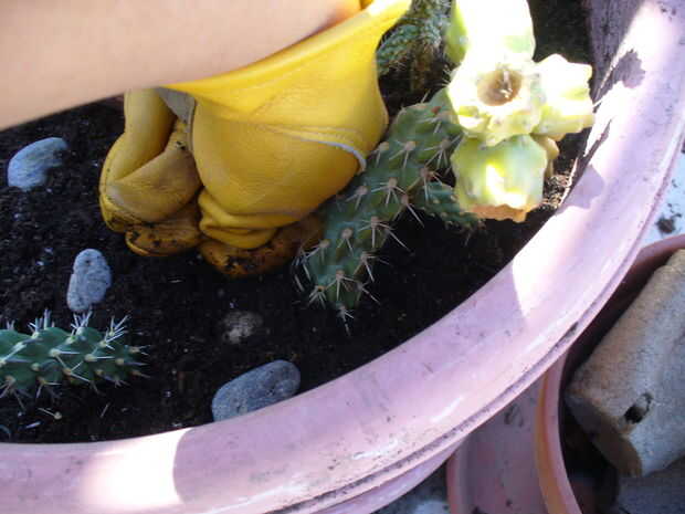 Luego colóquese los guantes y poner los cactus en el agujero y compactar la tierra alrededor de él (no demasiado!)