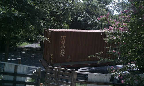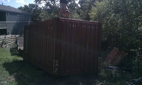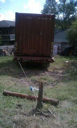 Si eres inteligente, te felicito: ya tienes una losa o alguna Fundación fácil configurar y sólo puede tener su nuevo edificio dejó perfectamente. Si eres como yo, no han previsto lo suficiente y tendrá que mendigar rápidamente algunos material redondo grueso (piensa en postes de teléfono) para configurar el contenedor para facilitar ajustes. He utilizado ~ 6" de diámetro alrededor de postes de madera.