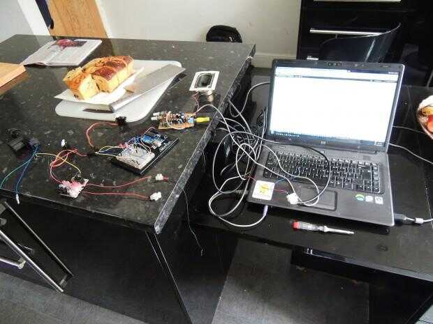El sonido del discurso generado necesario para mover la mandíbula. Es decir, debe ser lip-synced. Un cable de salida fue conectado a la computadora, y esto era pasado a través de un circuito amplificador de audio sencillo, rescatado de un viejo altavoz de la computadora (esto se muestra aquí a la derecha de los bollos de Chelsea).