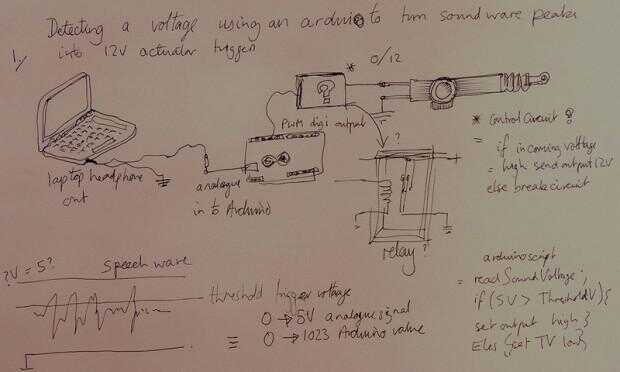 La señal de salida de audio amplificada portátil se alimenta directamente a la entrada analógica de la placa Arduino. El Arduino, un esbozo de control repetidamente comprobación de que la tensión de pico Arduino convierte la entrada analógica en un número, que comprueba con un valor de umbral máximo preestablecido.