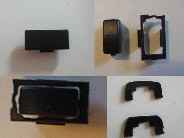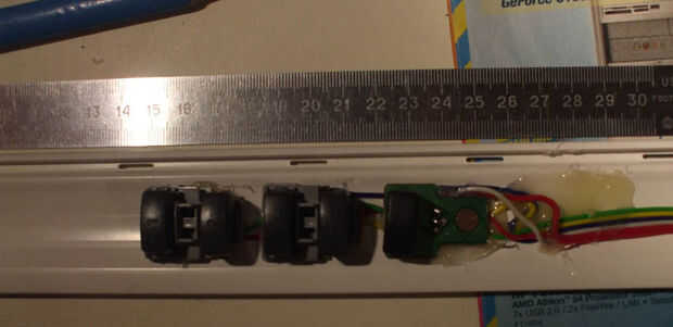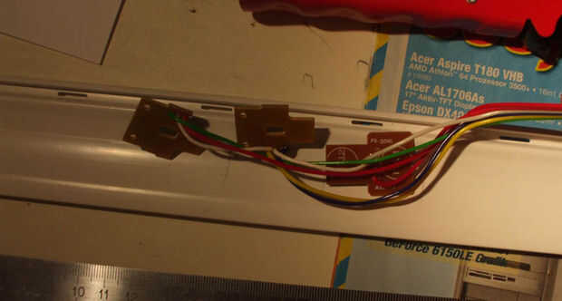 Habrá 5 botones de traste, así que necesitarás 3 placas de circuito disparador botón para esto (un botón será sin usar aunque). Tomar una de las piezas de la rodar-tapa y medir esos botones de traste y lugar ellos en su lugar como desee - averiguar la distancia cómoda entre los botones. Cortar los cables del traste según y soldarlos a las CBs. Es necesario tener una tierra común (por lo que usted necesita un cable de 6 hilos)-Nota el cable blanco de tierra. Adhiera las CBs ahora. Añadir algunas piezas de plástico para sujetar los botones en sus lugares. Ellos y los cables, pegamento también.