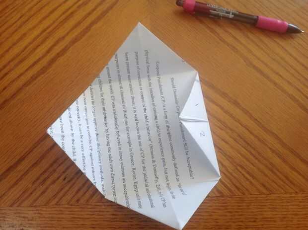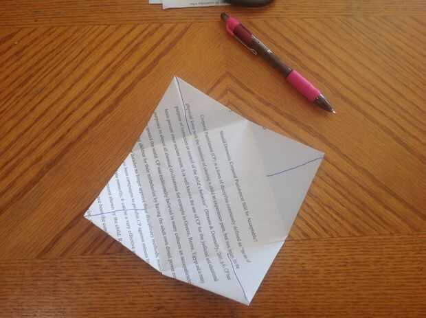 4. Ahora abra las aletas de triángulo y dibuja un linetheough el pliegue que divide los triángulos en dos como en la imagen.