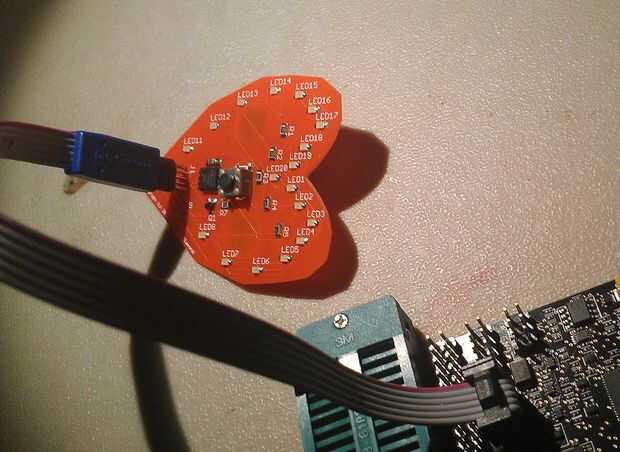 Primero "hacer fusible" para fijar los fusibles de programación. Si todo va bien verá LED 17 y 18 parpadeo. Si obtiene errores acerca de no poder blanco o fracaso para entrar en modo programación, probablemente tiene algunas conexiones sueltas o puente en el chip del attiny. Pasar estos con flujo y soldadura o soldadura mecha según corresponda.