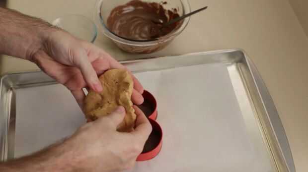Ahora tenemos que añadir la mezcla de mantequilla de maní (1/4 de taza de mantequilla de maní, 1/4 a 1/3 taza de azúcar en polvo, 1/4 de cucharadita de sal y 1 cda de mantequilla - lo he hecho sin la sal extra y la mantequilla, y todavía funciona muy bien). Primero se forma un poco de forma de corazón en nuestras manos y luego coloque encima de la capa inferior de chocolate y extienda con los dedos.