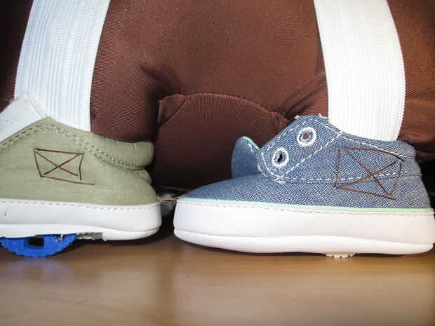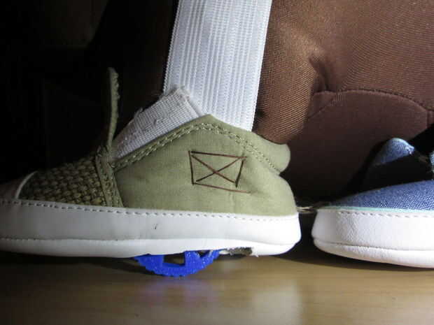 Ahora es el momento para iniciar el proceso de montaje. En esta parte necesita reunir cerca de 4 pies de cinta elástica y cerca de 1 pie de velcro y rebabas. Empezar cortando cuatro 8 pulgadas (puede cambiar dependiendo del tamaño de su oso de peluche) correas elásticas y 4 piezas de velcro y las rebabas de 1,5 pulg. Coser la correa larga en el lado exterior de cada zapato como se muestra en la imagen 1. Luego coser los pedazos más pequeños de la correa en el interior de cada zapato. Coloque un trozo de velcro en el interior de los pedazos más pequeños de la correa y un pedazo de fresa en la parte superior dentro de parte de cada pie de DJ Barnyard.
