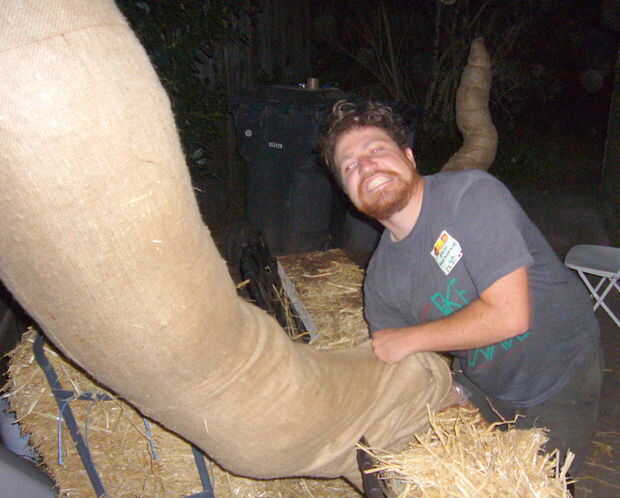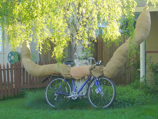 Este 16 pies largo lombriz bicicleta fue competido con en la Davis mortal Derby VI con Equipo gusano Bin (yo, Clara, Jenny, Bobby y el Rezz). Obtuvo el tercer lugar de 10 equipos! Es marco de soporte es tubo de PVC de 3 pulgadas, la piel es de sacos de arpillera y relleno es paja. Pesa alrededor de 35 libras, cuestan unos $40 para construir (no incluyendo la bicicleta) y 6 horas en hacer. Clara y Jenny tenían trajes de escarabajos coprófagos y composteros (cartulina) eran zip atado en algunas motos.