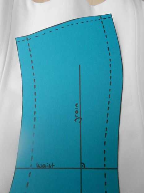 Telas deben cortarse en un grano. Dibujar un ángulo recto desde la línea de la cintura para obtener el grano. La veta recta paralela a la orillo.