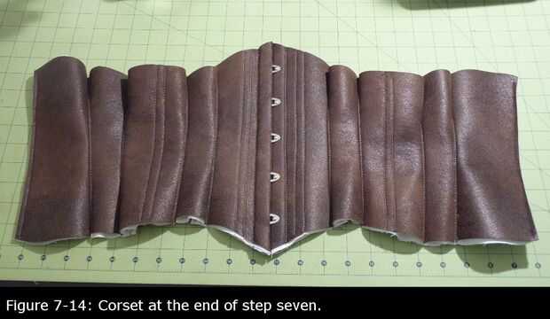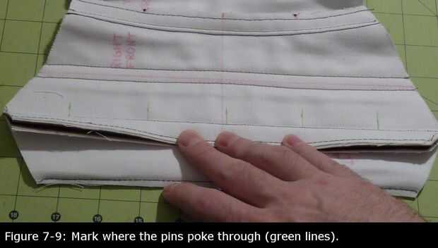 Doblar sobre el frente derecho y alinear con la mitad izquierda del corsé. Inserte las clavijas en el