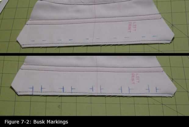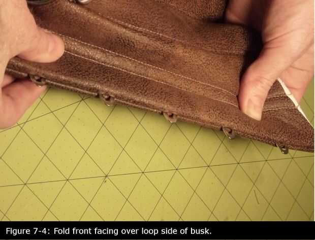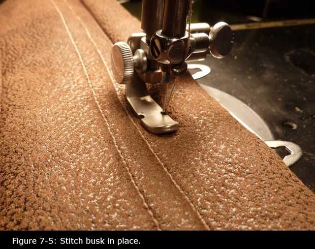 hilo de rosca, puntada 5/8 de pulgada desde el borde, cogiendo el frente frente y atrapando la busk en lugar