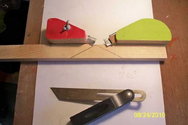 En un estándar boxcutter, ocupa el ángulo de la hoja en cerca de 62 grados. No tiene que ser perfecto, pero el diseño que en sus bloques de madera cerca de un ángulo. Este corte en la Sierra de banda y luego la arena a la forma.