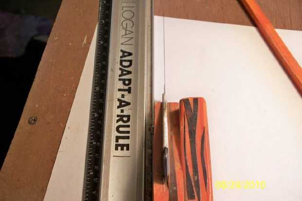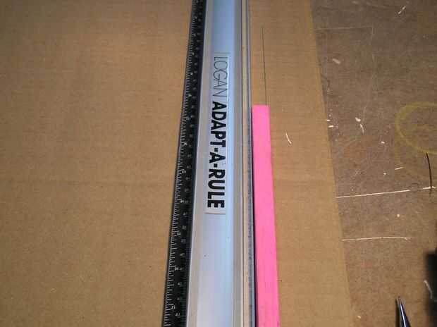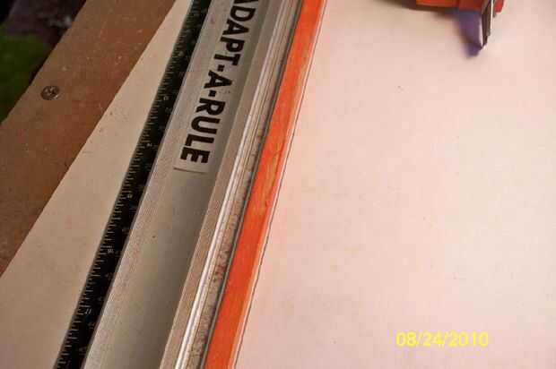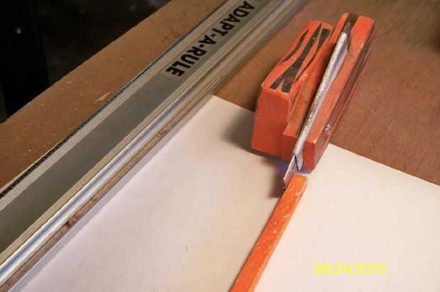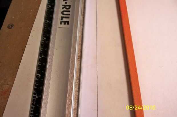 Por falta de un término mejor, se denomina esta guía de compensación. Para hacer cortes bastante precisos que desea poder Coloque el borde recto y corte a lo largo de su línea. Para ello, se corta un trozo de madera para cada corte y color les codificado.