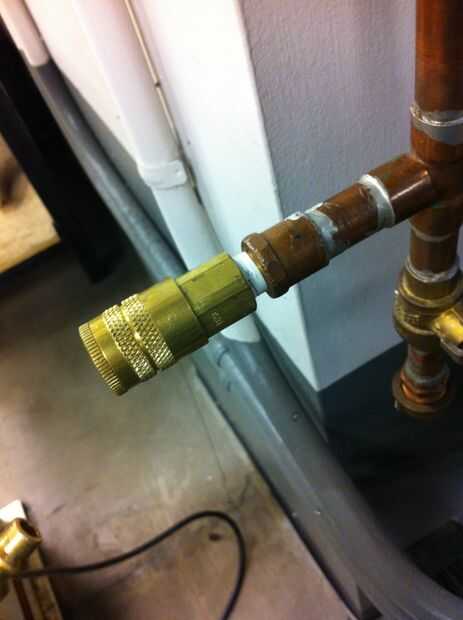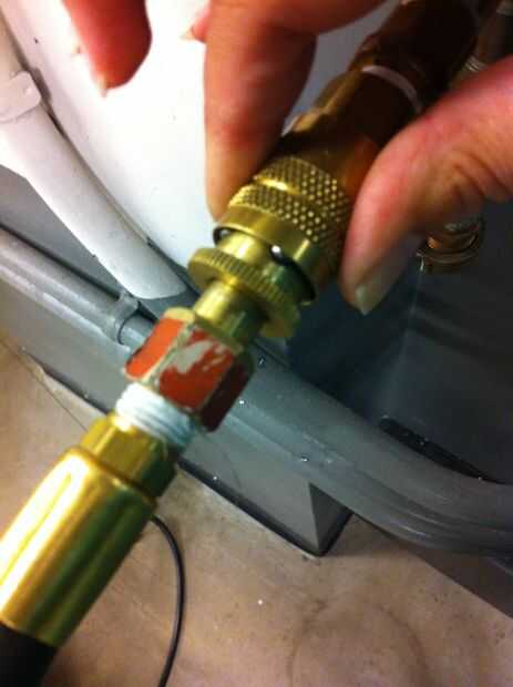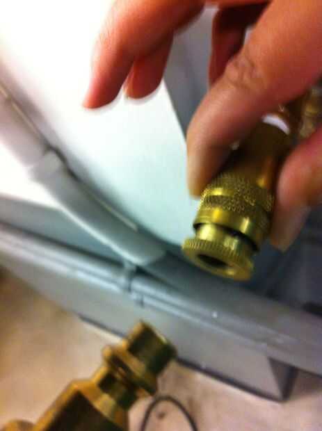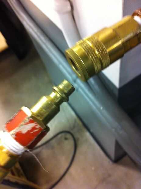Conectar el compresor de aire externo a la cortadora de plasma.  Esto es para asegurar que el flujo de plasma se mantiene bajo alta presión. Para colocar los accesorios, retrocede la pestaña exterior de la conexión hembra e inserte la conexión macho.