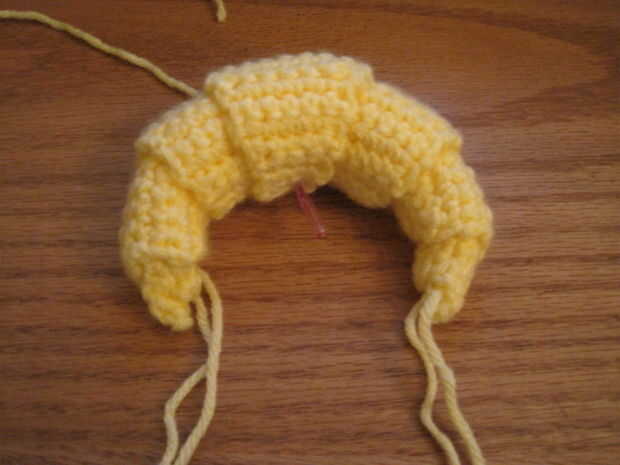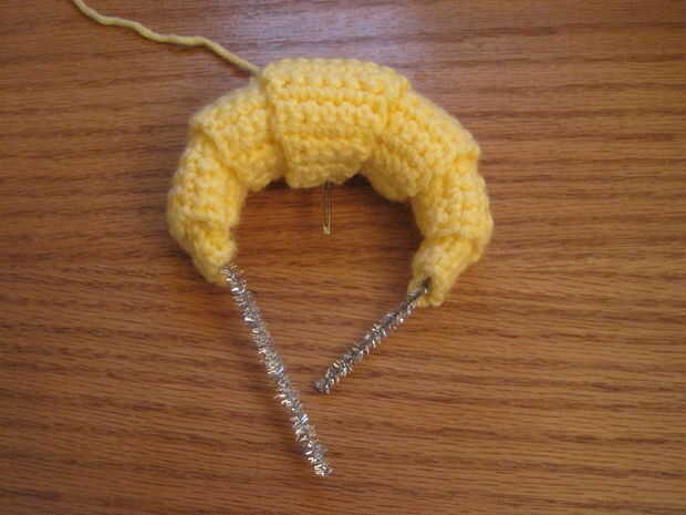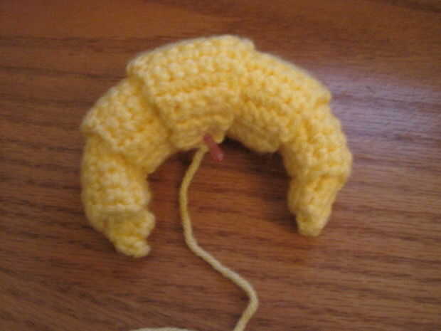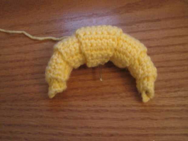 Ahora solo tienes que hacer un par de cosas menor antes de que termine su croissant. Hayan rodado para arriba, corte extra poco del limpiador de pipa/alambre de modo que usted no puede ver ya. Utilizar algún hilo amarillo para coser las puntas juntas y ocultar el cable de limpiador de pipa. Una vez que hayas hecho esto deshacerse del hilo sobrante. Entonces lo último que tienes que hacer es usar el hilo que sigue en la punta y cose la parte superior de la aleta. No es necesario coser mucho, lo suficiente como para mantenerlo hacia abajo. Y listo! Su croissant crocheted es completa!