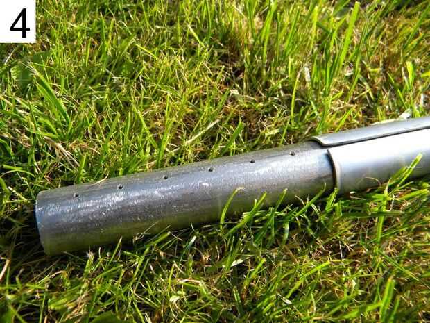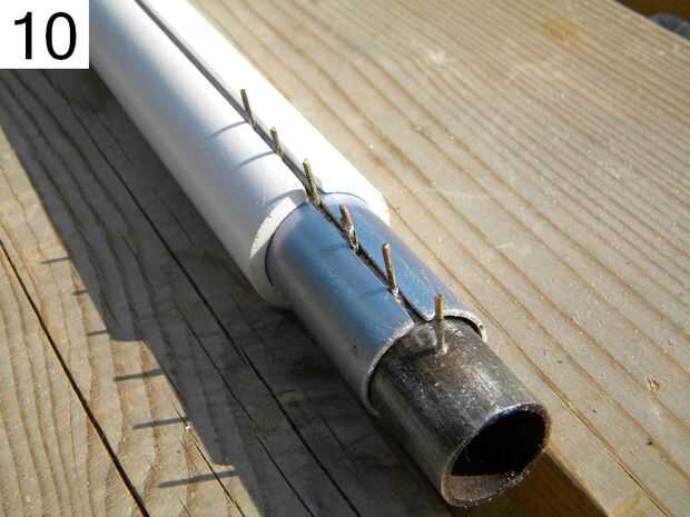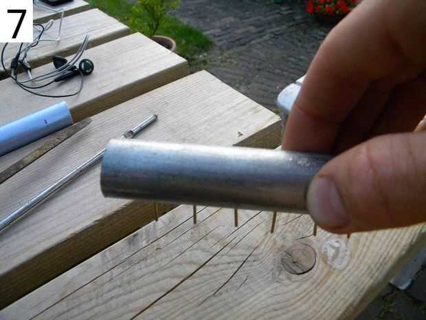 7: Sujete el tubo más pequeño por lo tanto, que los orificios en la parte inferior. Ahora conseguir los clavos en los orificios, desde el interior! Por lo que la cabeza de los clavos debe estar dentro del tubo. Este es un trabajo desagradable, puede utilizar tijeras o algo como una ayuda.