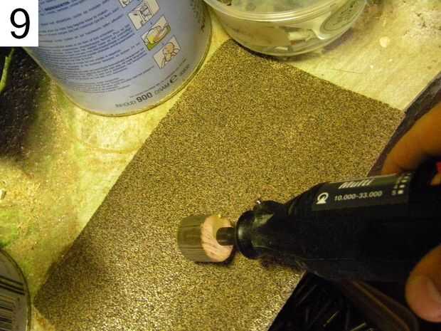 9: Manténgalo en el áspero papel de lija como esta y dejar que la Dremel haga el trabajo para usted. Usted puede todavía moverlo un poco mientras está girando para que el proceso sea aún más rápido. Deje que la Dremel vuelta tan rápido que no deja manchas negras en la madera. ADVERTENCIA: Usted realmente necesita usar gafas con esto. La Dremel se rápido y dispara las partículas de la lija. Esto podría lesionar los ojos.