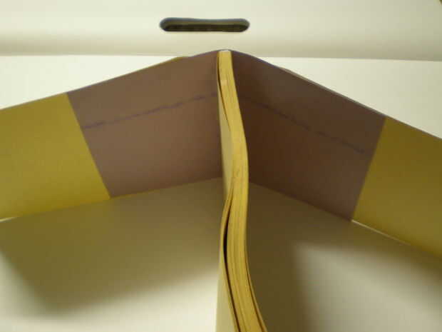 3. una vez que el pegamento se haya secado, aplique una capa delgada de pegamento sobre la columna vertebral y presione el papel con firmeza a la columna vertebral. Doblar el centro de la cartulina hasta que los papeles de relleno están perfectamente entre él. (véase el cuadro si confundido) La abrazadera junto con dos clips de la carpeta. No pegar las solapas restantes en las páginas!