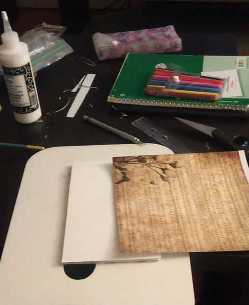 Primero elige el material que desea utilizar para la columna vertebral, utilicé cardstock. Luego aplique una capa ligera de la cola del atascamiento de libro y conecte a la notebook.