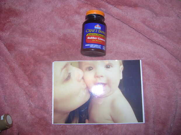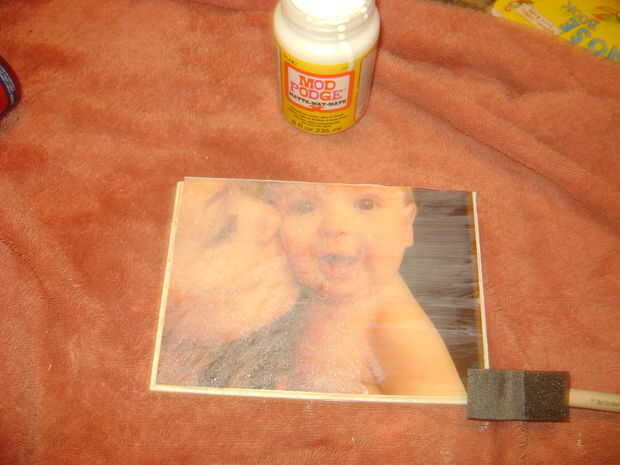3. utilizando el cemento de goma, pegar la imagen en la tablita de madera. Es más fácil de colocar pegamento en la placa pero también se puede poner el pegamento en la fotografía. Dejar secar completamente (check-in 5 minutos, dar más tiempo si es necesario)