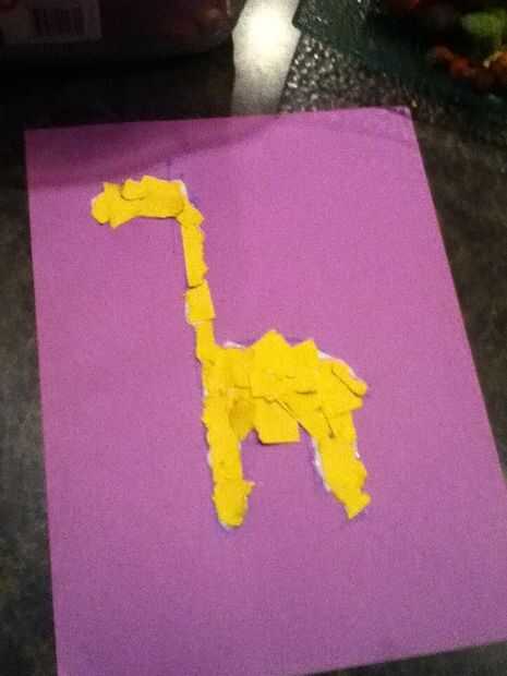 Tomar el papel amarillo y el pegamento. Pegar todo sobre la jirafa. Corte pedazos de papel amarillo y pegarlo en el pegamento. Cubrir la jirafa entera.