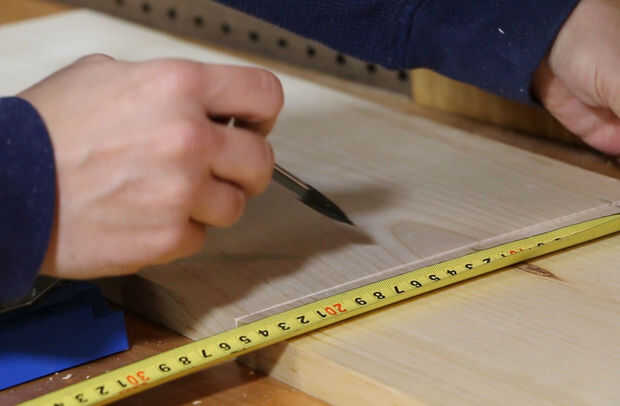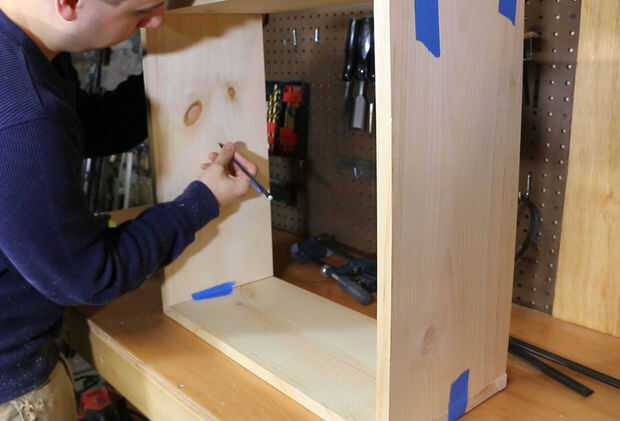 En primer lugar, limpiar la veta de las tapas y los lados con un plano de la mano para que las superficies son planas. Luego, con cinta de enmascarar, ajuste seco el marco del estante del vino juntos. Marca una "X" en el interior cara de cada uno de los tableros laterales. A continuación, desea marcar donde van los agujeros de su bolsillo. Colocar los tableros laterales sobre una superficie plana, con la marca hacia abajo. Entonces, las líneas de diseño 4 o 5, unos espaciados uniformemente a lo ancho de la Junta. Transferir estas líneas a la parte superior y parte inferior de cada panel lateral con un lápiz.