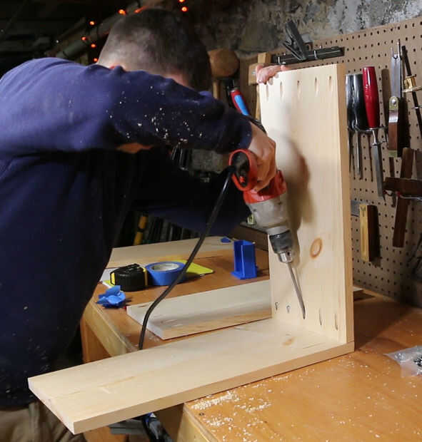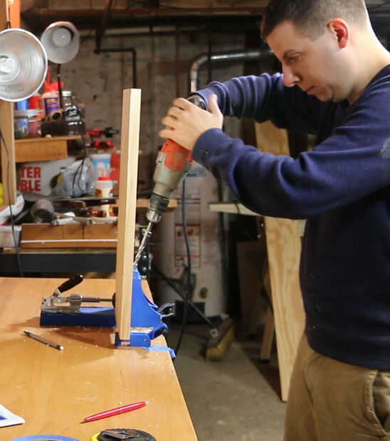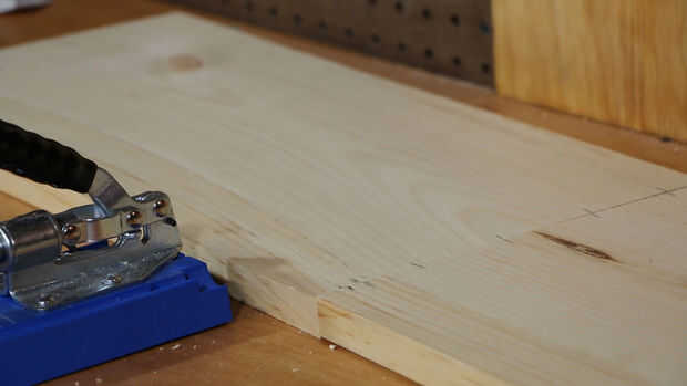 Luego, usando su Kreg jig, ajuste 3/4" material, que es el espesor de 1 x 10. Alinee el tablero lateral de manera que la cara marcada es hacia usted, luego perforar con su bolsillo. Voltear la Junta longitudinal y perfore los agujeros de bolsada en el extremo opuesto de la Junta y repita este proceso para la otra pieza lateral.