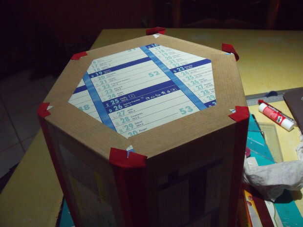Cortar seis tiras de 2,5 x 28 cm en el papel normal. Luego pegar uno por uno en la articulación de dos trapecios. La tira debe ser más largo 1,5 cm más de cada lado. En la parte inferior de la basura, cortar el papel extra por el medio y pegamento abajo hacer esto en la parte superior y pegar las dos piezas a cada lado de la articulación. Hacer lo mismo para todos los rincones.