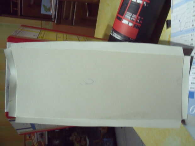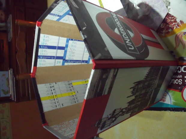 En la cartulina, cortar seis trapecios con una altura de 26,2 cm, 12 cm de ancho en la parte superior y 9 cm en la parte inferior. Pegamento en el papel de la fantasía. El papel debe ser 2 cm más largo en cada lado. Hacer esto para los seis trapecios. Cortar las esquinas en ángulo recto y pegar los lados detrás de la cartulina. Pegue un pedazo de cartón en la basura y luego pegar el papel extra dentro del cubo de la basura y la basura. Hacer lo mismo para todos los lados.