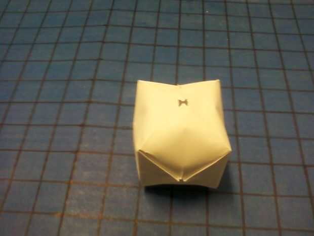 Foto a continuación es el producto terminado, un cubo de origami.  Los bordes pueden pellizcados para pliegue en forma de cubo más definida, si se desea.