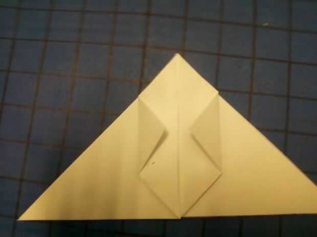 Doblar las dos esquinas exteriores de los nuevos triángulos de la cara superior hacia adentro para el pliegue del centro.