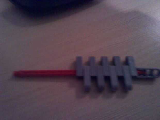 este es un mini cuchillo balístico procedente de suministros de oficina. La parte de ejercicio no sólo sería el mondadientes. Pros - fáciles que provee Cons - rango 5-7 pies (o alrededor de 1.5-2 metros) - 'cuchillo' girará hacia fuera después de 5 p