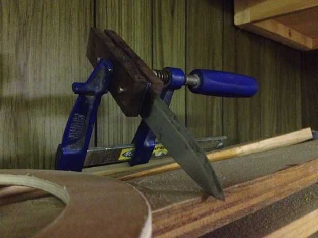 Usted necesitará un epoxi de dos partes, preferiblemente con un largo tiempo. No soporto los cinco minutos más, agregan a la tensión. Yo JB weld, pero cualquier pegamento de epoxi de dos componentes debe trabajar. Lo siento no consigo alguna fotografía más de esto, pero estaba en un apuro en el momento y sólo limpia olvidó. Es bastante simple, solo mezclar el epoxi juntos en algo separado, como un cuadrado de cartón. Luego, utilizando un palito o algo como eso, raspar el epoxi sobre la balanza, el tang, los pernos y todo el resto de su área de trabajo. Luego fijarlo con la abrazadera para limpiar el desorden, asegúrese que la hoja del cuchillo esté limpio y esperar el tiempo de secado especificado. (En mi caso 24 horas)