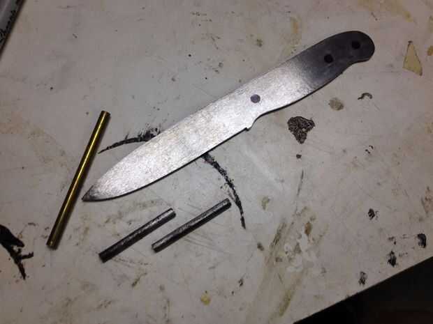 Los pernos que utilicé fueron 3/16 niquel plata de un cuchillo en línea hacer proveedor. También puede utilizar varilla de latón, vender que las ferreterías más grandes.