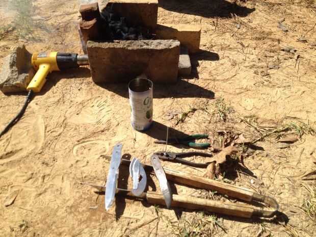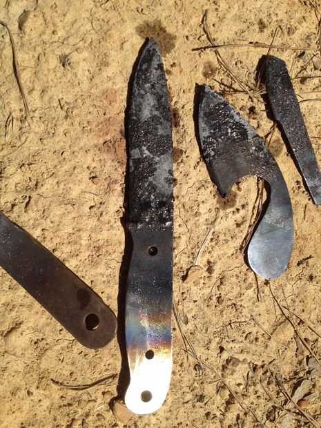 Entonces es mi favorita de parte, el tratamiento térmico. ¿Qué es tratamiento térmico? Ya te contare. Cuando usted consigue una pieza de acero, es muy suave. Facilita la forma de la arena y moler hacia fuera de la forma. La desventaja es que es demasiado blando para ser un cuchillo. Así que hay que endurecerlo. La mejor manera de hacer esto es calentar hasta que brilla intensamente caliente en la fragua, y luego la dunk en aceite. El aceite enfría muy rápidamente, la única pega es que ahora es tan difícil es tan frágil como el vidrio y se rompería si se cae. Es por eso que luego pegarlo en el horno por un par de horas a 400 grados. Calentando poco a poco lo nuevo que, poco a poco ablanda el metal, hasta que la dureza perfecta para una lámina de cuchillo.