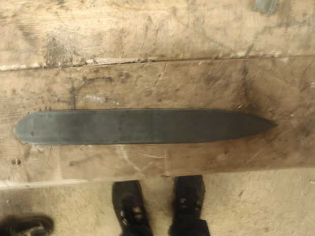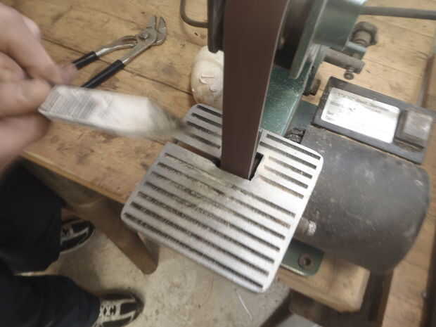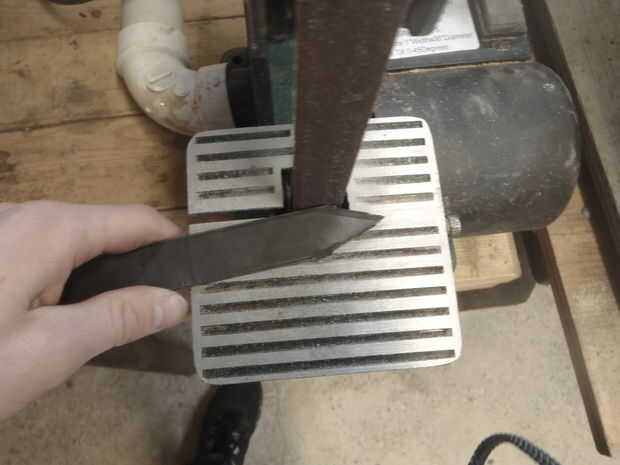 A continuación está moliendo en la lijadora de banda. Esto puede hacerse también con un archivo, pero si es así tienes que conseguir los cortes más cercano a la forma final con la amoladora angular. así, puede utilizarse un disco de amolar. Usar cualquier forma de hacer para obtener el perfil final de la hoja. después de esto viene el bisel de la cuchilla.