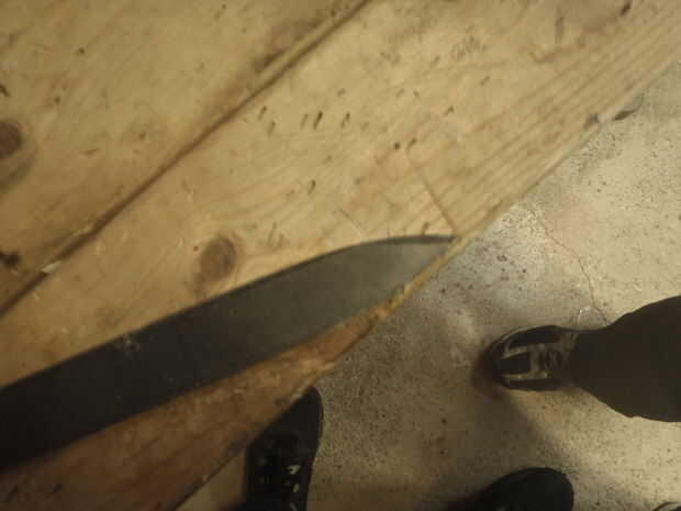 Con una amoladora y un disco de corte cortar la sección del cuchillo de la pieza más grande. cortan ambos lados de la hoja, seguido por unos cortes en la manija a redondo.