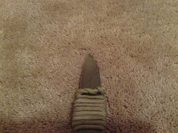 El material de la manija puede ser casi cualquier material que usted quiere. Madera, plástico, caucho y cadena incluso pueden todos hacer manijas grandes. Mina está hecha de un solo filamento de paracord. Si usted prefiere un mango más "permanente", tomar dos tablas delgadas de madera y utilizar dos o tres remaches para perno de juntos.