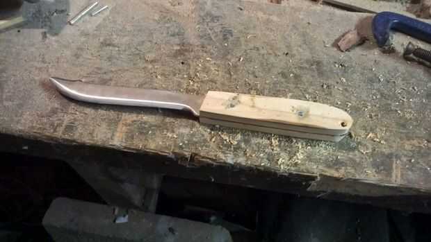 Para dar forma a las escamas para que coincida con el tang, coloca la hoja en un tornillo de banco con la hoja envuelta en una esponja y utilizado una dremel para lijar suavemente hacia fuera de las ranuras de mi mango. Una vez que tuve la forma que quería comenzó el mango entero, todavía con la dremel, para que el cuchillo mejor cabe en mi mano.